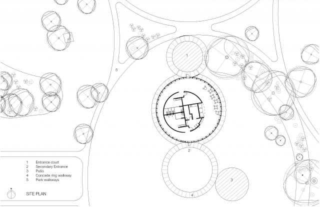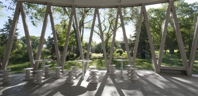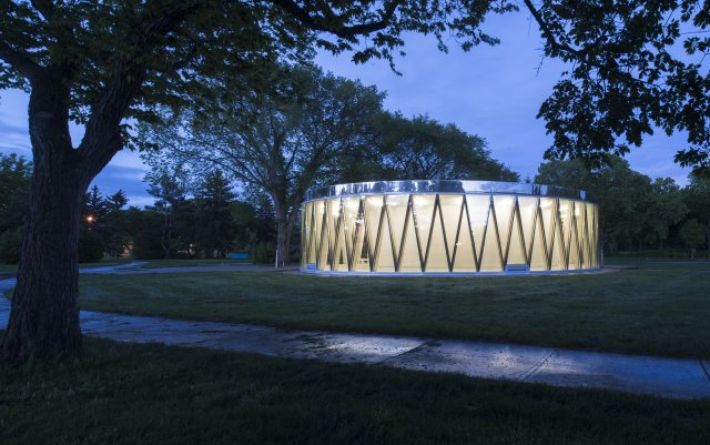 larger revitalization program updating this 100 year old park which has been home to everything from Edmonton’s first zoo to amusement park rides such as carousels and a roller coaster. The pavilion’s circular form and expressive timber truss structure echo this playful history, evoking the whimsical qualities of a child’s toy drum and the merry-go-round that once occupied the park.