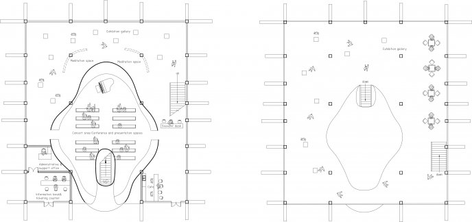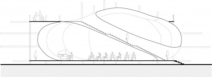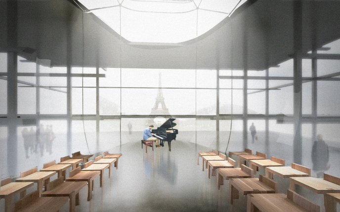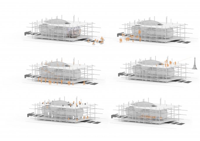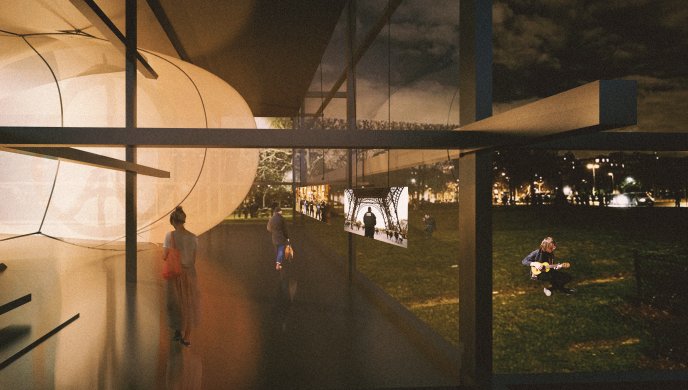 The project is on the axis of Champ de Mars, directly facing the Eiffel Tower. Visitors arrive at an exhibition space on the second floor through a tunnel in the bubble made of ethylene tetrafluoroethylene (ETFE) plastic. They then go down into the bubble through an exhibition gallery on the first floor. The material could create soft light for exhibition and meditation. The project creates a memorial space, as well as a meaningful city landscape.