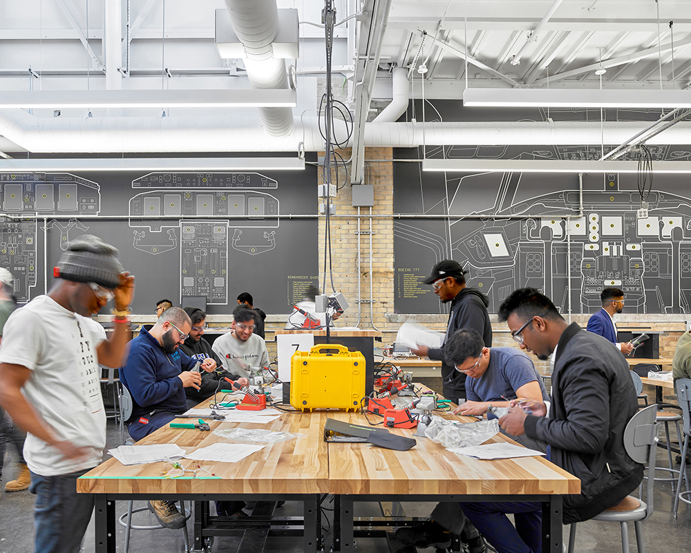 Spaces for student activity are designed to achieve a maximum variety of experience types—from quiet study and small group rooms to social seating and lively table tennis. A range of privacy and/or openness enriches the student experience on campus. The public spaces aim to connect students not only with one another, but also with the Aerospace program and the essence of the building; they have been designed with optimal views into the primary Hangar, as well as into the labs and teaching spaces, connecting students to and furthering interest in the campus’s program offerings.
