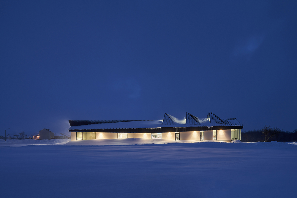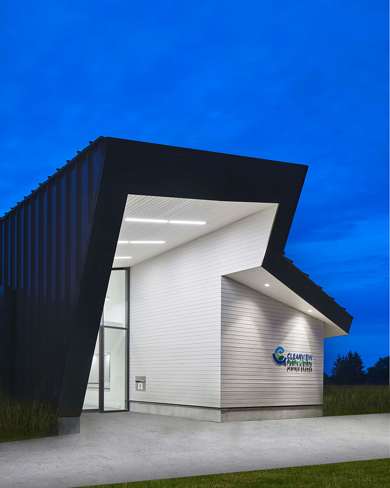 Clearview’s newest public library is a key project for Stayner’s community. A recipient at this year’s Ontario Library Association (OLA) awards, the library’s energized design language is a result of optimized programming integrated to passive environmental strategies. A modest 650 m2 in area, the building is thoughtfully connected to the local hockey arena with a small atrium and shared amenities. This result is a bright and airy family-friendly, locally scaled community hub with a powerful and iconic presence. With its folding rooflines, jagged clerestories, enormous views, and powerful design language, the complex is deeply connected to the surrounding landscape.