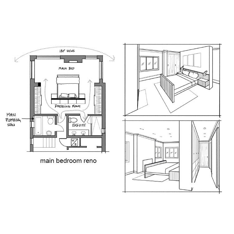 Below, are memories of past homes, and a small bedroom reno concept. Through sketching, there is an eye to hand translation and training that develops the visual and physical memory to understand and recognize the hierarchy of elements, proportions, and scale required in design;