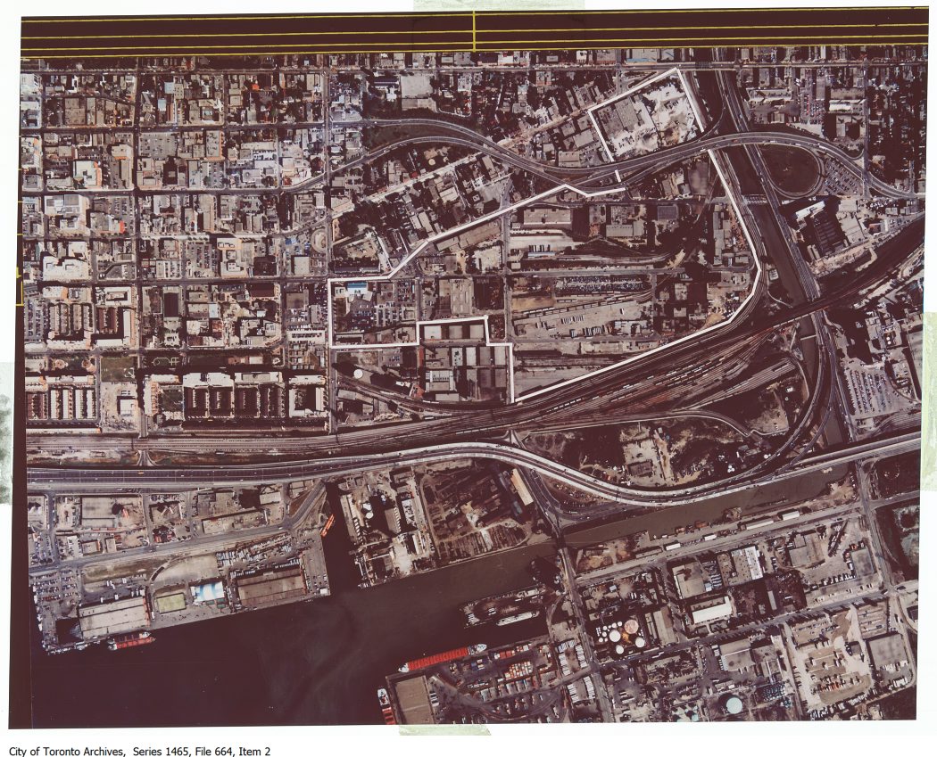 Aerial over the lower Don River with a bold white outline around the Canary District/West Don Lands Community (1980-1988). Image courtesy of the City of Toronto Archives.