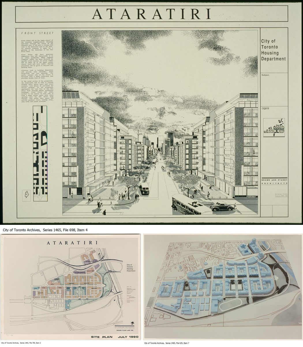 Top: Perspective drawing of Ataratiri development. Bottom left: Model. Bottom right: Site plan. Drawings courtesy of the City of Toronto Archives.
