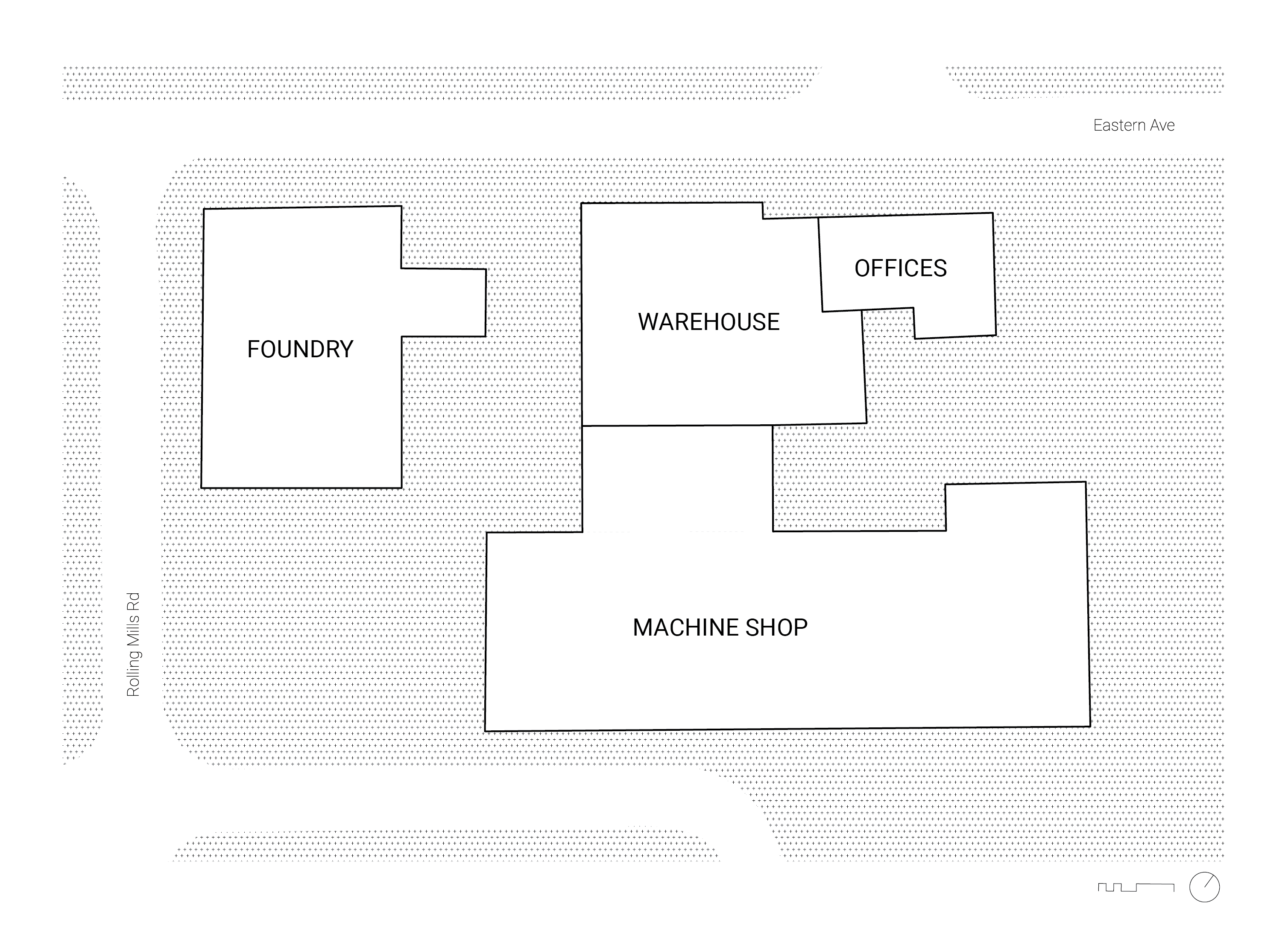 Site plan of the Dominion Foundry buildings. Only the Foundry and Machine Shop will be preserved in the proposed upcoming developments. Original drawing based on building configurations.