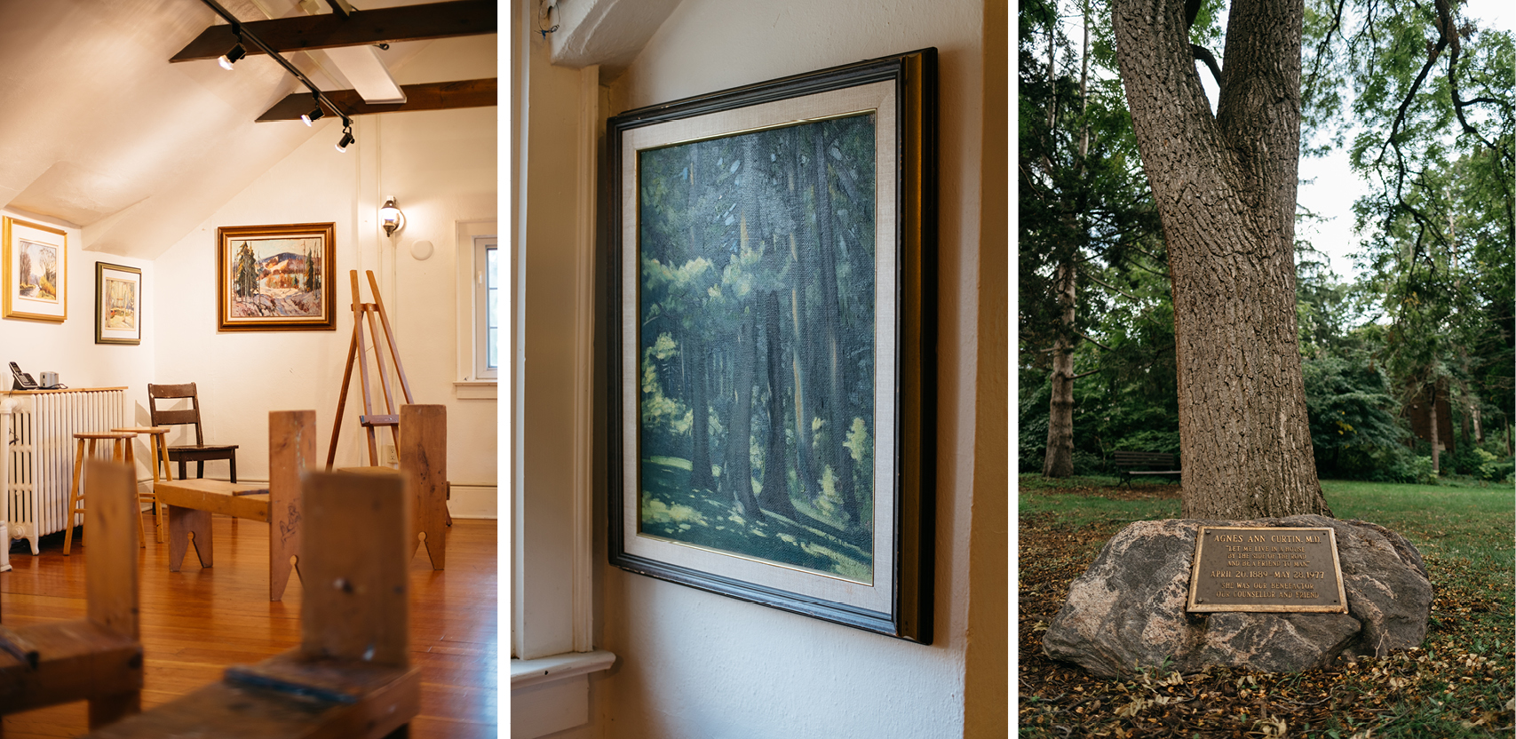 The second floor studio of the centre. Centre: one of the many paintings adorning the interior. Right: a plaque on the grounds dedicated to the memory of Dr. Agnes Anne Curtin. Photos: Kurtis Chen.