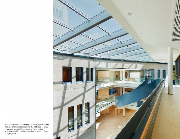 Built in Romanesque Revival style, Toronto synagogue Holy Blossom’s house of worship was the first institutional building in Canada to employ the use of board-formed concrete in 1938. It was followed by a Modernist house of learning in the 1960s. This addition shifted the architectural centre, causing a maze-like experience. In 2003, with the congregation looking to the future, the project demanded the restoration of the historic buildings and a comprehensive renewal—one that unifies Holy Blossom, celebrating the congregation’s Jewish identity.