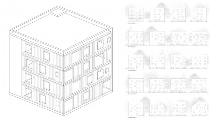 The urban niches are activated by the punctual integration of four-storey timber cubes. With a surface area of only 13.35 x 13.35 m, the cube houses react sensibly to the existing buildings, granting the character of the green open spaces of the estate to keep their appearance. The new buildings are designed as a modular timber prefab system. This system allows flexible layout possibilities for site-specific needs and responds to individual demands. The houses can adapt to differing apartment combinations, surface area, circulation, façade and building form requirements.