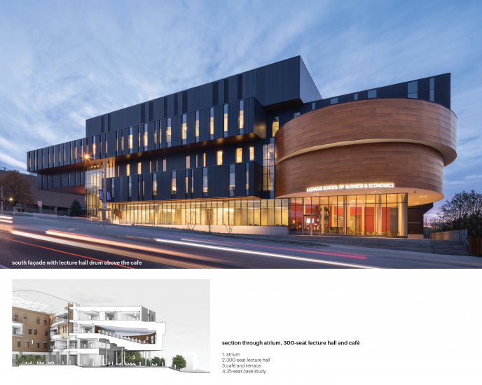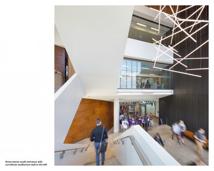 Lazaridis Hall has become a landmark for both Wilfrid Laurier University and its new business school. The building is a crossroads, bringing together academic and entrepreneurial ambitions. Connecting people in Waterloo—a tech region—it is seen as a significant gesture for the university in the 21st century. The 1,000-seat auditorium had acoustic properties that support convocation, special speakers, lectures, conferences, as well as music performances. The combination of the auditorium and atrium accommodates a wide range of activities, providing a much-needed non-structured space for students, faculty, campus, and the surrounding community. It is a catalyst, cultivating connections.