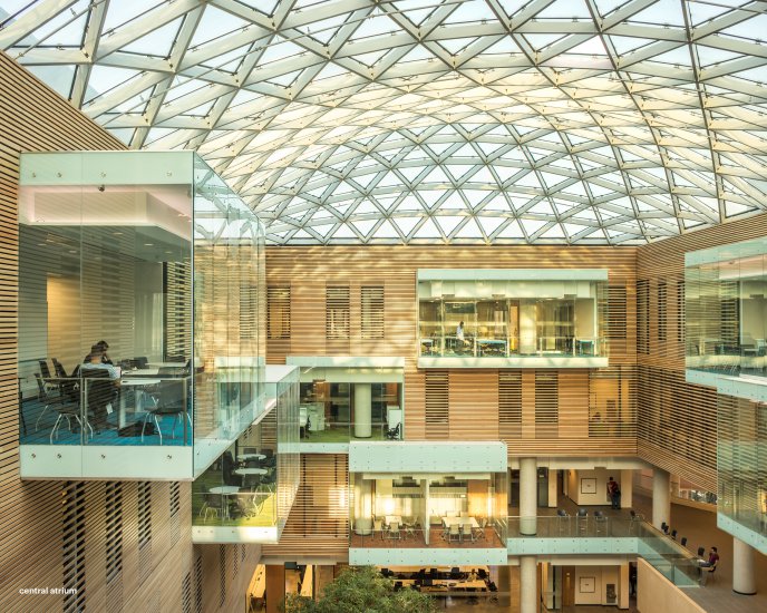 The formal composition for Lazaridis Hall includes shifting floorplates, punctuated by curvilinear volumes. These volumes, at either end, contain an auditorium and a lecture hall; the latter floats above a glass-encased café. These moves refine the expression of this steel-and-concrete building. Inside, a homogeneous glass-and-steel skylight crowns the central gathering space—a light-filled atrium. The prefabricated frame of the skylight allowed for minimal customization, reduced budget, and ease of installation. A hub for collaboration, the building’s hybrid program is clustered carefully to foster cross-pollination amongst participants in various disciplines. The building’s dynamic facade also enlivens the streetscape along University Avenue.