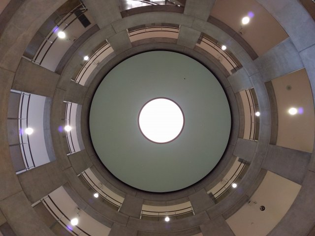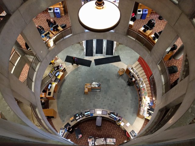 The depth of the entryway punctuates the impression of a solid, sturdy mass—entering the library is like entering a castle. Inside is a spacious cylindrical atrium ringed by a stair, the clear, symmetrical geometry making the library's organization clear. Walking up the curved stair is a slow progression through the spaces of the library, allowing peeks into stacks, busy seating areas, and some of the collections. Glass separating the atrium from spaces allows for visibility but also carefully controlled climate around the rare collections.