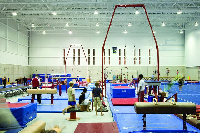 Phase 3, the Sports Complex. was the final phase of this ambitious sports facility. While physically interconnected with the existing arena complex for ease of operations and multi-venue usage, the core design goal for the Sports Complex was to create a unique yet complimentary identity. Attached to the original 5,400 seat NHL spectator arena and three community ice pads, the Sports Complex includes a field house containing a regulation size FIBA soccer field, as well as a triple gymnasium and separate gymnastics training centre for the City’s elite-level club. Support spaces include 24 accessible change rooms equally convenient to the gymnasium and field house and interconnected in pairs to provide for larger teams. Dedicated separate change rooms are provided for gymnastics club members. A third level above the main lobby accommodates office and retail space for associated sports organizations and services. Two outdoor artificial FIBA soccer fields and associated freestanding change-house provide further program capacity.