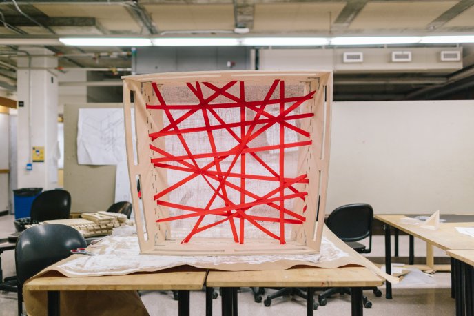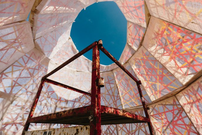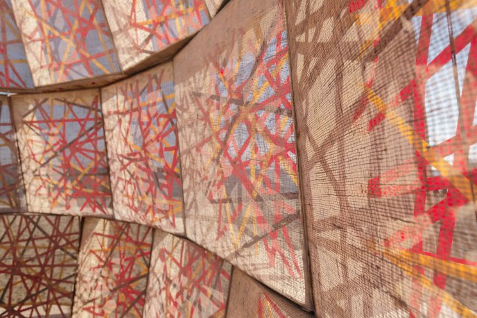 NEST is driven by the idea of creating a space of comfort and introspection within a system of complexity and disarray. Inspired by the impromptu structures that people would construct during public demonstration, it uses readily available materials, but in unconventional ways, to create a unique form and experience. The overwhelming nature of information and everyday life is expressed through the chaotic texture and asymmetrical form of the installation. Composed of modular cells that contain a weave of colourful webs, NEST provides both shelter and playful moments of light and shadow within the space. A rigid structure and chaotic exterior is contrasted with the more calming simple interior. The internal experience allows the visitor to momentarily step away from the noise, pause and view the world through a clear lens.