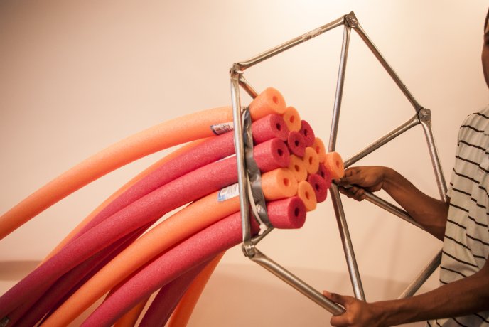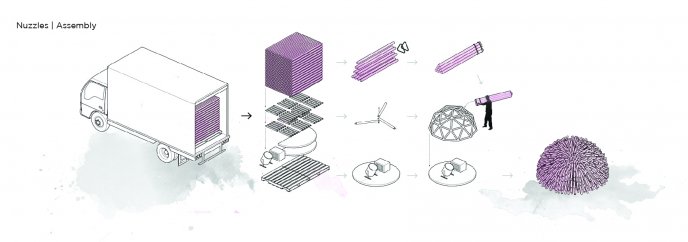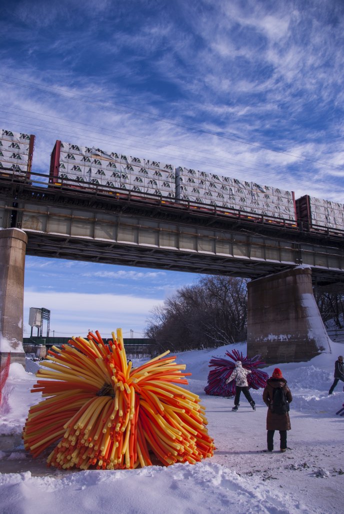 These furry Nuzzles emerged from a desired to challenge the notion of the prototypical hut. Open to the elements, they still provide a sense of shelter, enticing kids and adults to snuggle in as they protect themselves from the wind. A nuzzle insulates them by trapping warm air close to their core. The bright colours of the pool noodles from which they are made stand out in the snowy surroundings, and their flexible forms invite interaction. People of all ages, especially children, are drawn to the sculptures and engage with them in every conceivable way: jumping into them, climbing on top of them and, of course, nuzzling with them.