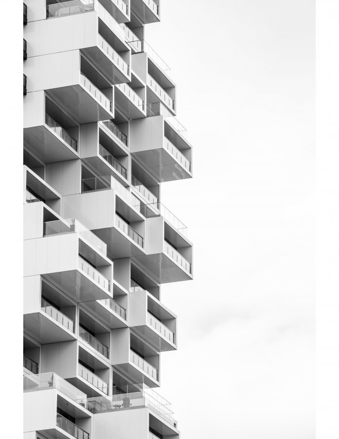 Evoking the mineral characteristics of the previous phases, Phase 3 is a continuity of the volumes that shape the entire complex. It is composed of the angular crystalline minerals of black and white. The tower conceptually erodes to symbolize this dual mineral nature: a solid black object inset with white diaphanous crystals. Each apartment is the expression of individuality. Each is a living element you pile up to create complexity. The constant push and pull of these white boxes proliferate up the tower reinforcing the notion of individuality for each unit, assembling as a complex erosion of the white crystal.