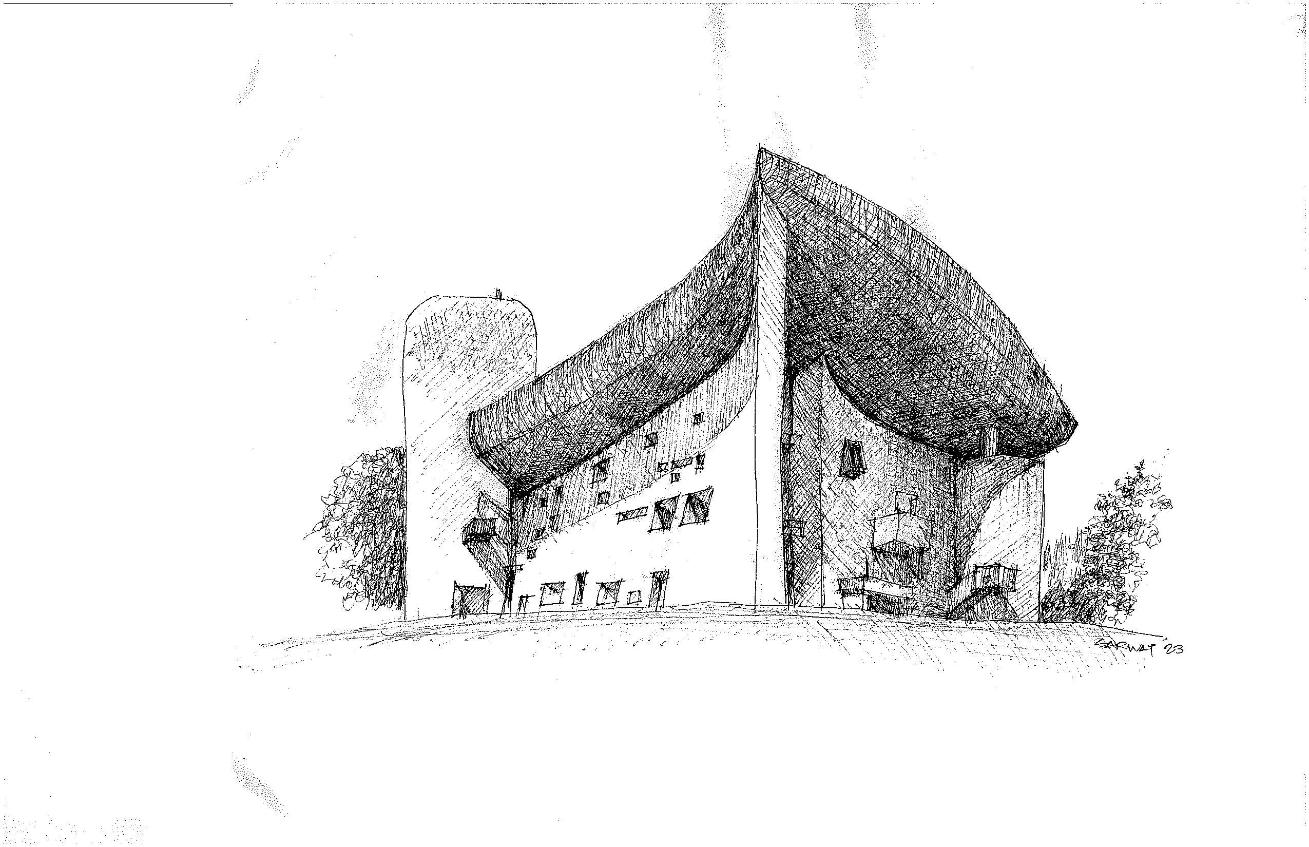 Sketch of Le Corbusier's Ronchamp chapel by Sarwat Ahmed