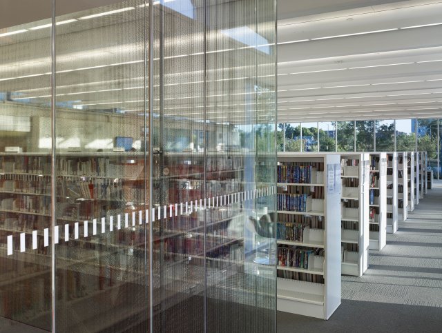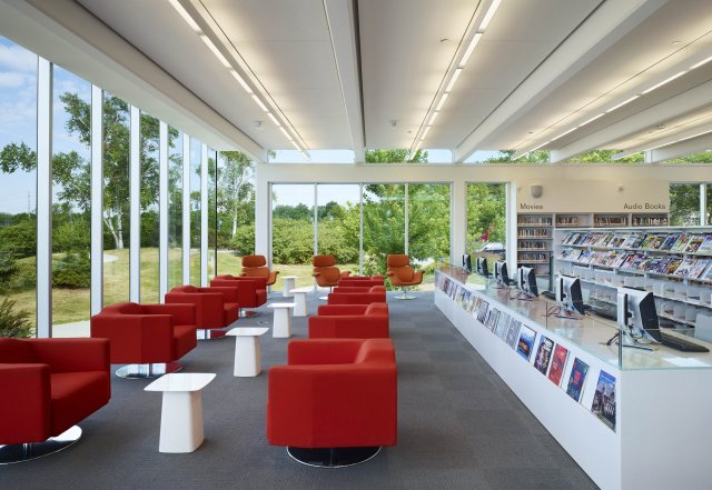Interior View of the Port Credit Library reading atrium. Photo Credit: Tom ArbanIn the interior, the architects have restored the original open plans through the use of contemporary strategies including structural glass partition walls and low shelving. These interventions increase sight lines and views within and out of the libraries, and help reinstate the original Modernist aspiration of three clear, rational and open pavilions floating above their natural settings.