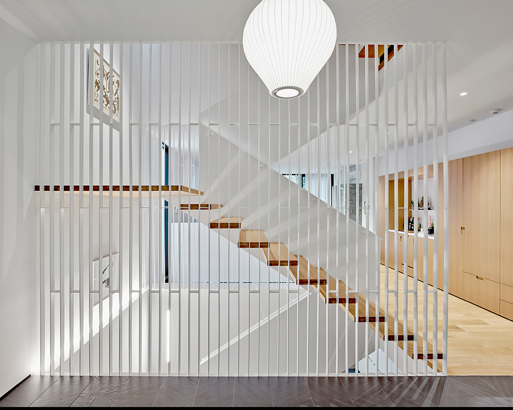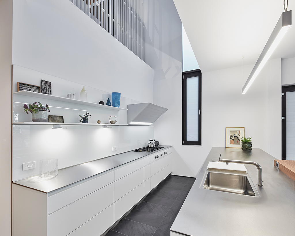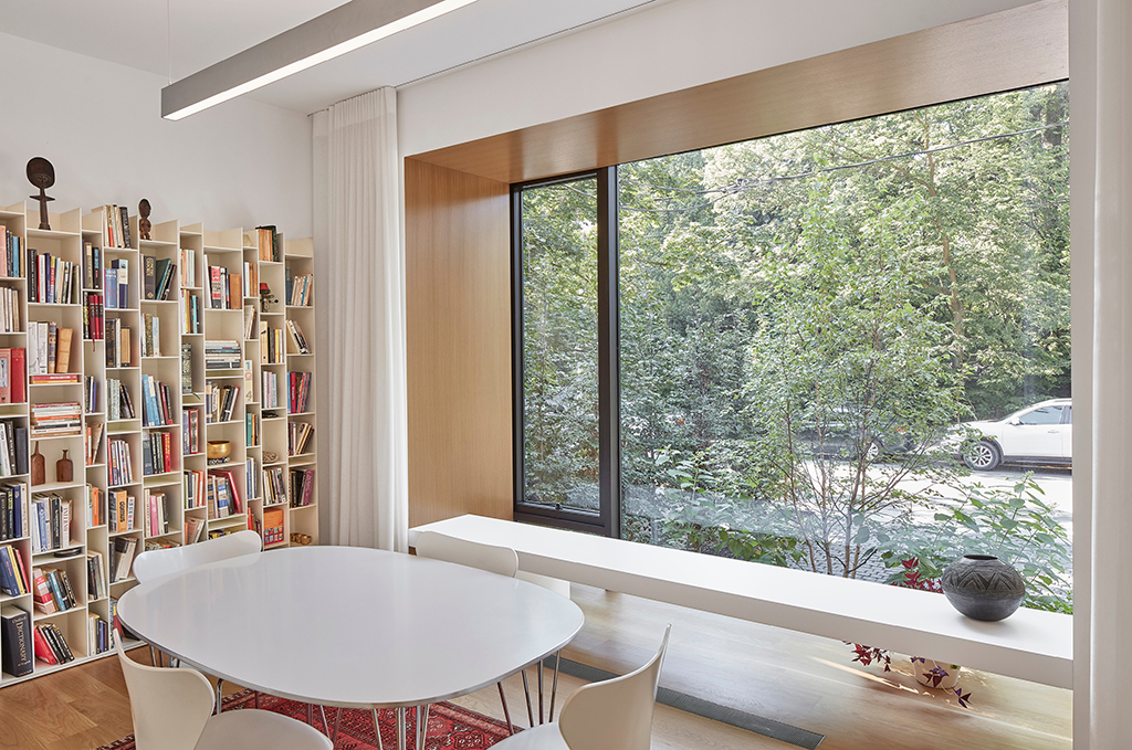 The house strikes a balance between standing out and blending in; it mimics the form of its adjacent neighbours, however through subtle design moves and no street-facing front door, it announces its differences. The house sits on a deep, sloped site with a forested backyard that provides a quiet sanctuary with views to the downtown core. To maximize the connection to the backyard, primary living spaces are split across two floors: the kitchen and dining sit in the walk-out lower level, and the living room and office on the main floor.