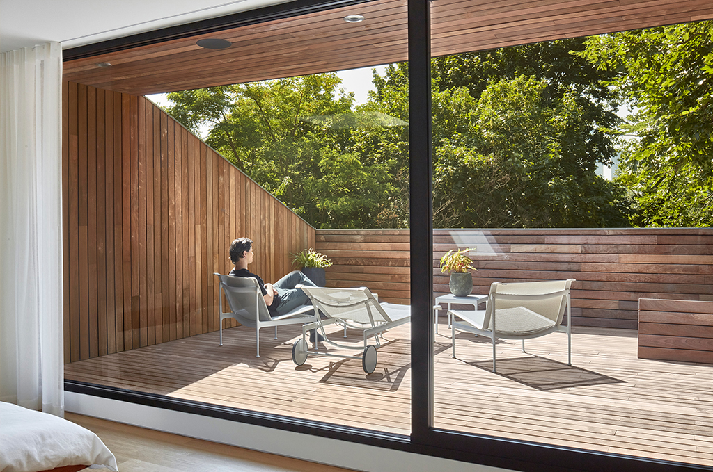 Tile House supports the unique requirements of the empty-nest homeowners through the flexibility inherent in the design. The only traditional doors in the house are to the washrooms; the rest of the house is divided by oversized sliding panels. When the owners are home alone, the panels can be tucked away, allowing for the home to function as one oversized, interconnected suite. When they host guests, the sliding panels can be closed, allowing the house to function as a more traditional four-bedroom home. The compact, stacked footprint permits the use of robust, high-quality materials and products within the budget.