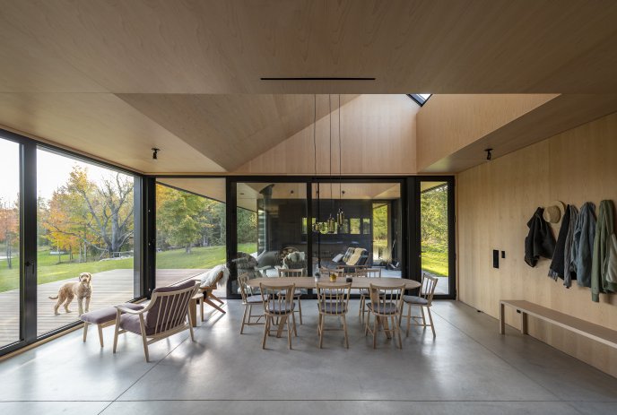 By retaining the existing 19th-century cabin rather than building completely anew, material usage is substantially reduced. While glazed walls admit vast amounts of natural daylight, deep overhangs and sliding wood screens mitigate excess solar gain. Operable skylights encourage passive ventilation eliminating the need for air conditioning, improving air quality for the inhabitants. With sustainability as a consistent priority for the architects, other attributes include high-performance glazing, a heat-recovery ventilation system paired with a super-tight building envelope, and slab, wall, and roof insulation levels that significantly improve on minimum requirements imposed by the Ontario Building Code.
