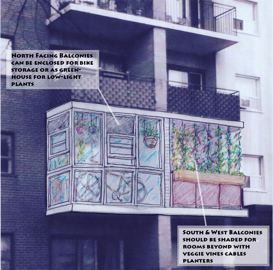 My quick watercolour and pencil crayon sketches demonstrate a low-cost method for shading apartment units, particularly for west-facing facades. The planters can be DIY sub-irrigated reservoir planters.