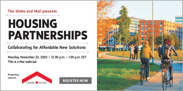 The Globe and Mail, in partnership with Canada Mortgage and Housing Corporation, will host a webcast on Monday, November 23rd to highlight the power of new partnerships in addressing Canada’s housing needs and supporting Canadian growth and prosperity.