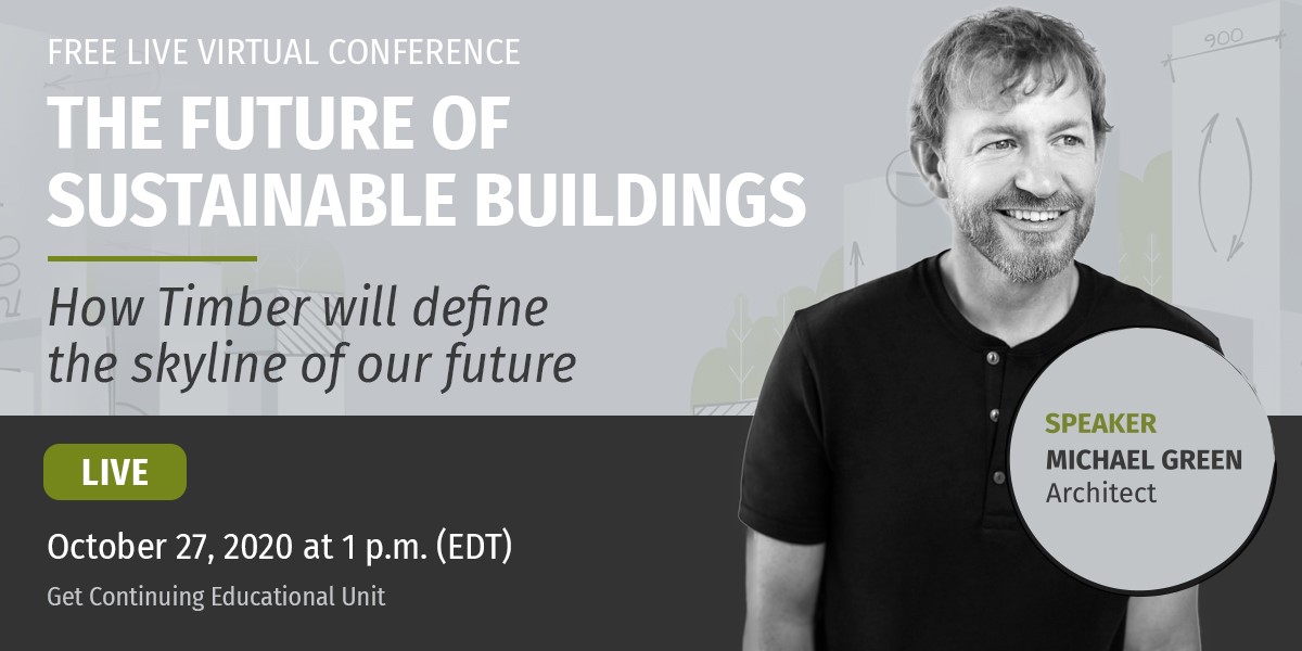 We are very pleased to invite you to The Future of Sustainable Buildings free live virtual conference presented by Michael Green. It will enhance your understanding of green building and sustainable development as well as deepen your fundamental knowledge of building emissions.
