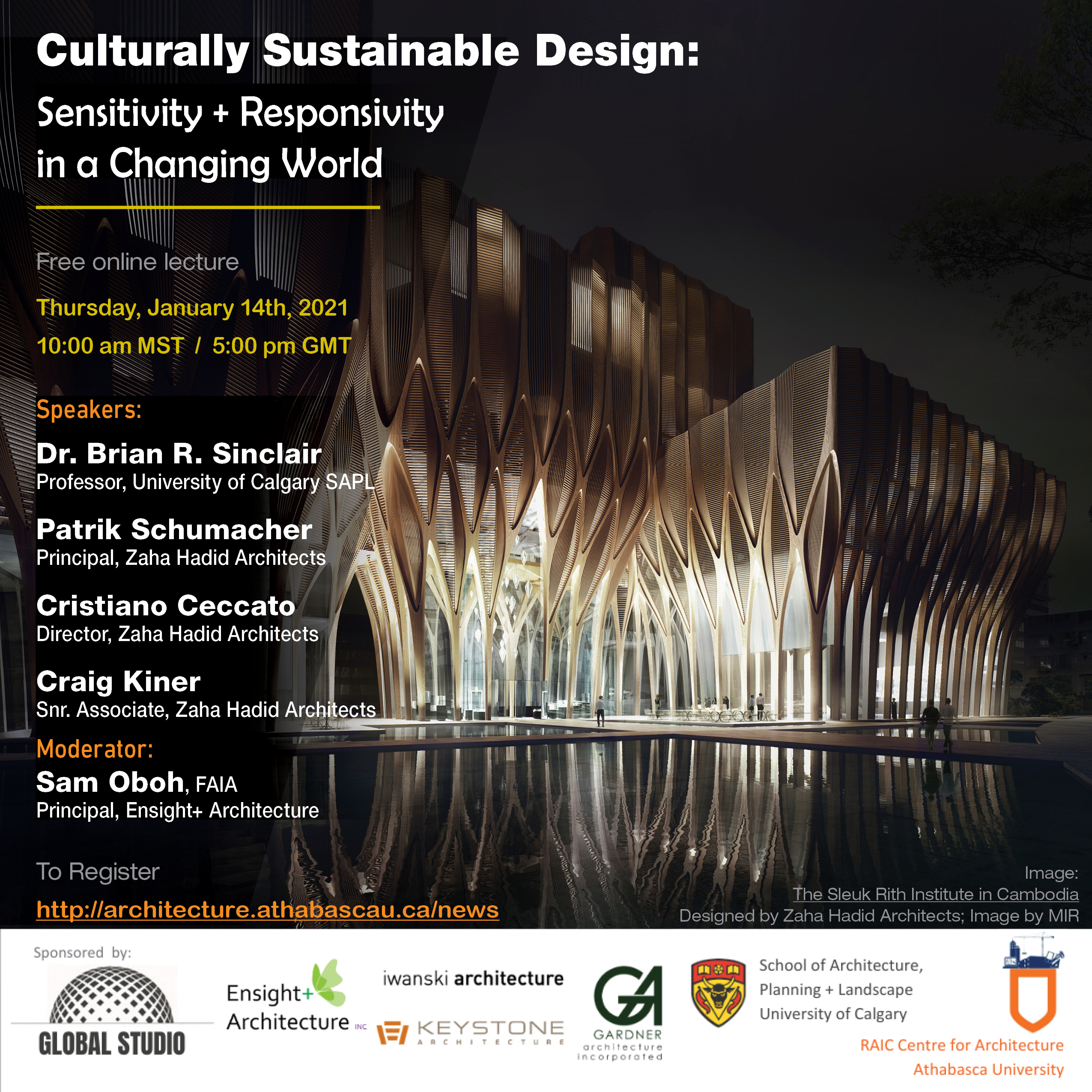 Zaha Hadid's principal architect, Patrik Schumacher, ZHA senior partners Cristiano Ceccato & Craig Kiner, with Dr. Brian R. Sinclair, professor at the University of Calgary, will be discussing the topic of Culturally Sustainable Design. The session will be moderated by Sam Oboh, principal architect at Ensight + Architecture.