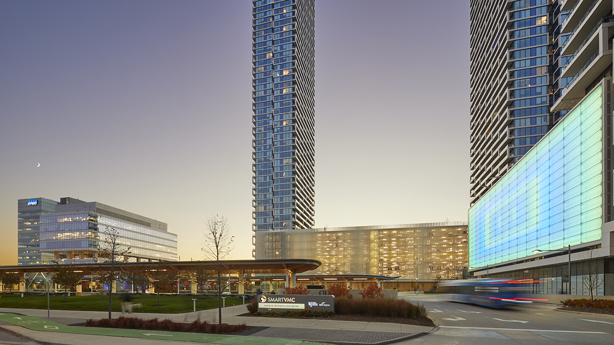 The SmartVMC is a mixed-use community emerging in Vaughn. Positioned at the terminal station of the Toronto-York Spadina subway extension, it is home to York Region Transit’s new transportation hub. The development's centrepiece is a mass timber bus terminal set within an urban park. The terminal inverts convention by enveloping the bus loop in public space. The PXL Gallery, a 10,000-sf programmable light installation delineates the northern edge of the park while providing commuters with a rotating program of exhibitions. The project points the way to a low-carbon future that embraces civic excellence and architectural expression.
