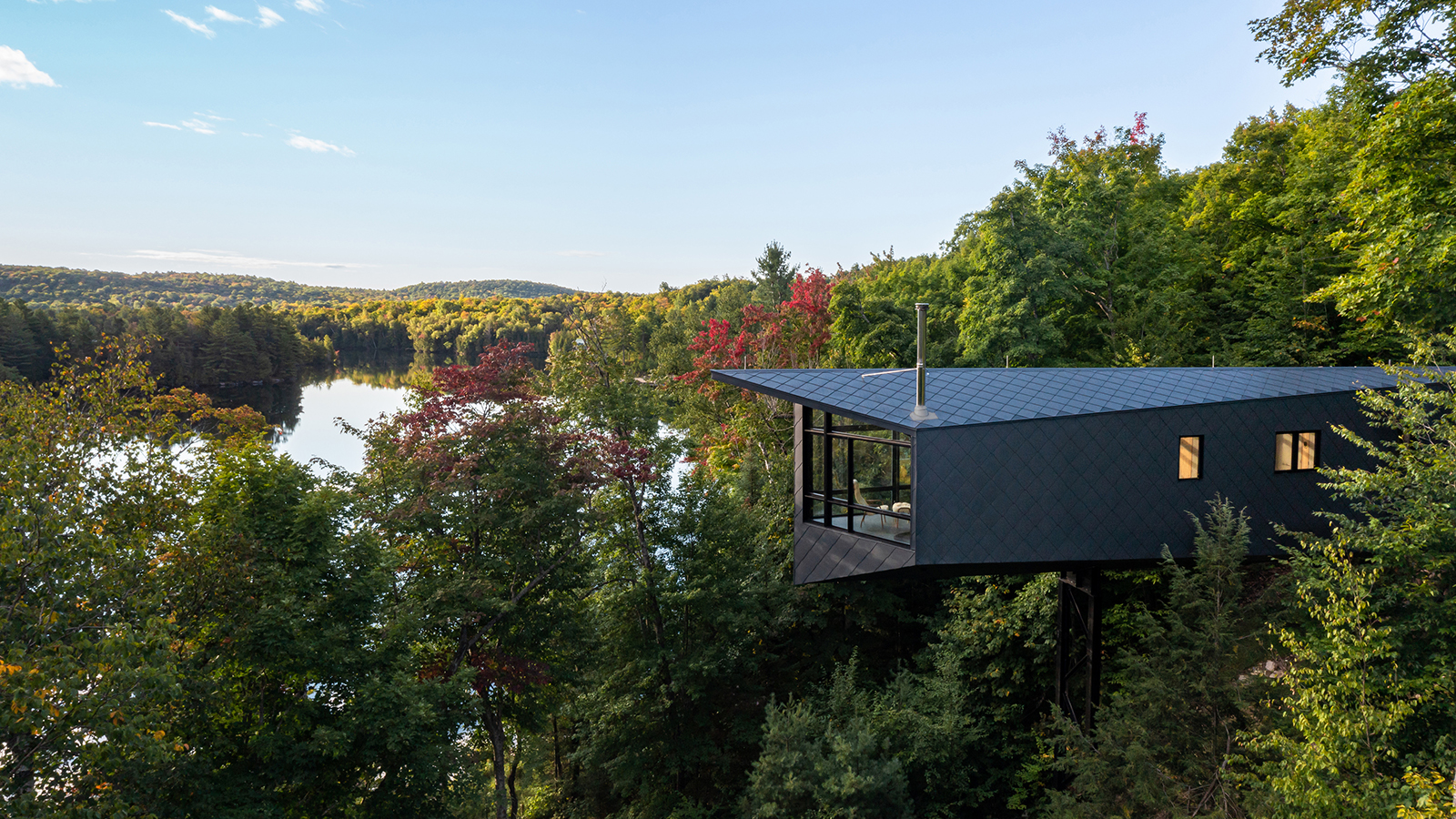 Most North American cottages look like they’re at one with the landscape, but they’re just as unsustainable as other homes. While m.o.r.e. Cabin is physically separated from the landscape, it’s much kinder to the environment. Cantilevered over a lakeside landscape outside La Pêche, Québec, m.o.r.e. Cabin preserves as much of the forest habitat as possible—after all, that’s why we have cottages in the first place. It also addresses carbon emissions, construction materials, and processes. It even provides a home for endangered local brown bats.